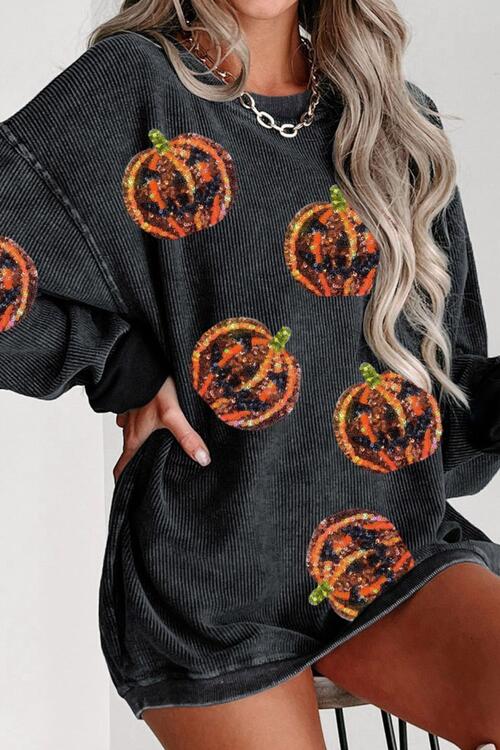 Sequin Patch Pumpkin Round Neck Sweatshirt